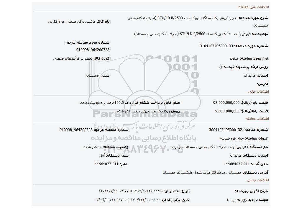 | توضیحات: فروش یک دستگاه دویپک مدل STU/LD B/2500 (اجرای احکام مدنی چمستان) | ||