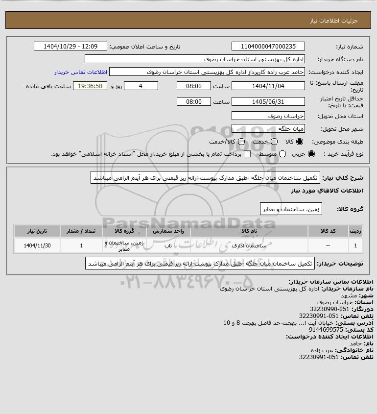 استعلام بها و موضوع استعلام استعلام تکمیل ساختمان میان جلگه -طبق مدارک پیوست-ارائه ریز قیمتی برای هر آیتم الزامی میباشد به اطلاع کلیه شرکت‌ها و افراد متخصص واجد شرایط می‌رساند، آگهی گذار در نظر دارد از طریق استعلام بها، نسبت به انتخاب و دریافت پیشنهادات اقدام نماید. این استعلام با کد آگهی ثبت شده در سامانه خبرگزاری پارس نماد : 10157826 منتشر شده است. مشخصات استعلام : تاریخ شروع استعلام: 1404/10/29 آخرین مهلت ارسال پیشنهاد قیمت : 1404/11/04 و محل اجرای پروژه : استان مناقصات استان خراسان رضوی میباشد. استعلام قیمت مورد درخواست : استعلام تکمیل ساختمان میان جلگه -طبق مدارک پیوست-ارائه ریز قیمتی برای هر آیتم الزامی میباشد با دسته‌بندی‌های تخصصی و گروه های مرتبط : ساختمان, استعلام اطلاع رسانی میگردد.