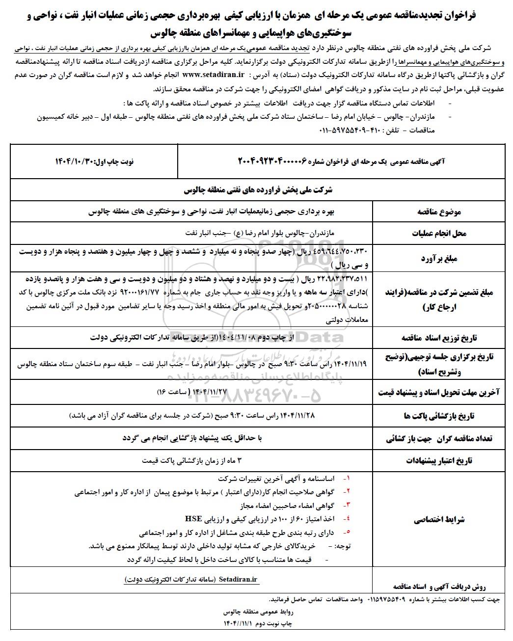فراخوان تجدید مناقصه عمومی یک مرحله ای همزمان با ارزیابی کیفی بهره برداری حجمی زمانی عملیات انبار نفت ، نواحی و سوختگیری های هواپیمایی و مهمانسراهای منطقه چالوس