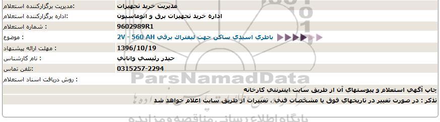 استعلام بها و موضوع استعلام استعلام, استعلام باطری اسیدی ساکن جهت لیفتراک برقی به اطلاع کلیه شرکتها و افراد متخصص واجد شرایط میرساند، آگهی گذار در نظر دارد از طریق استعلام بها، نسبت به انتخاب و دریافت پیشنهادات اقدام نماید. این استعلام با کد آگهی ثبت شده در سامانه خبرگزاری پارس نماد : 1015824 منتشر شده است. مشخصات استعلام : تاریخ شروع استعلام: 1396/10/13 آخرین مهلت ارسال پیشنهاد قیمت : 1396/10/19 و محل اجرای پروژه : استان اصفهان میباشد. استعلام قیمت مورد درخواست : استعلام, استعلام باطری اسیدی ساکن جهت لیفتراک برقی با دستهبندیهای تخصصی و گروه های مرتبط : لیفتراک, منابع تغذیه, قطعات خودرو, تجهیزات برق و الکترونیک, استعلام اطلاع رسانی میگردد.