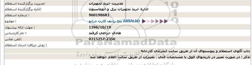 استعلام بها و موضوع استعلام استعلام, استعلام پنج ردیف کارت درایو ANSALDO به اطلاع کلیه شرکتها و افراد متخصص واجد شرایط میرساند، آگهی گذار در نظر دارد از طریق استعلام بها، نسبت به انتخاب و دریافت پیشنهادات اقدام نماید. این استعلام با کد آگهی ثبت شده در سامانه خبرگزاری پارس نماد : 1015855 منتشر شده است. مشخصات استعلام : تاریخ شروع استعلام: 1396/10/13 آخرین مهلت ارسال پیشنهاد قیمت : 1396/10/19 و محل اجرای پروژه : استان اصفهان میباشد. استعلام قیمت مورد درخواست : استعلام, استعلام پنج ردیف کارت درایو ANSALDO با دستهبندیهای تخصصی و گروه های مرتبط : اتوماسیون ، مراکز کنترل صنعتی, تجهیزات برق و الکترونیک, استعلام اطلاع رسانی میگردد.
