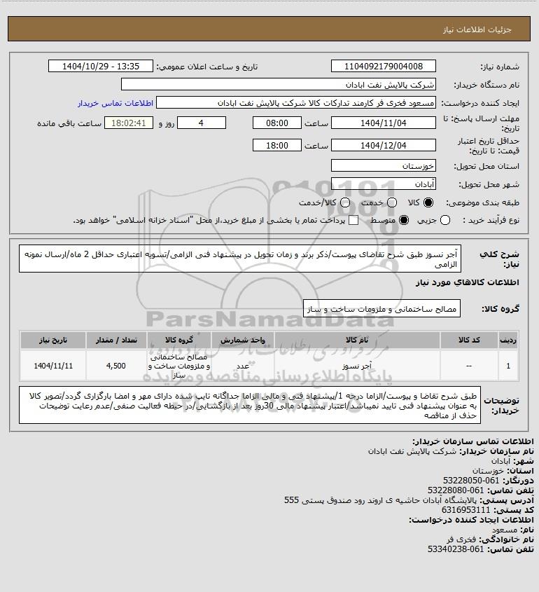 | 1 | -- | آجر نسوز | عدد | مصالح ساختمانی و ملزومات ساخت و ساز | 4,500 | 1404/11/11 |