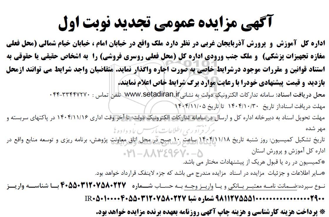 اداره کل آموزش و پرورش آذربایجان غربی در نظر دارد ملک واقع در خیابان امام ، خیابان خیام شمالی (محل فعلی مغازه تجهیزات پزشکی) و ملک جنب ورودی اداره کل (محل فعلی روسری فروشی) را به اشخاص حقیقی یا حقوقی به استناد قوانین و مقررات موجود در شرایط خاصی به صورت اجاره واگذار نماید. متقاضیان واجد شرایط می توانند از محل بازدید و قیمت پیشنهادی خودرا با رعایت موارد برگ شرایط خاص اعلام نمایند.
