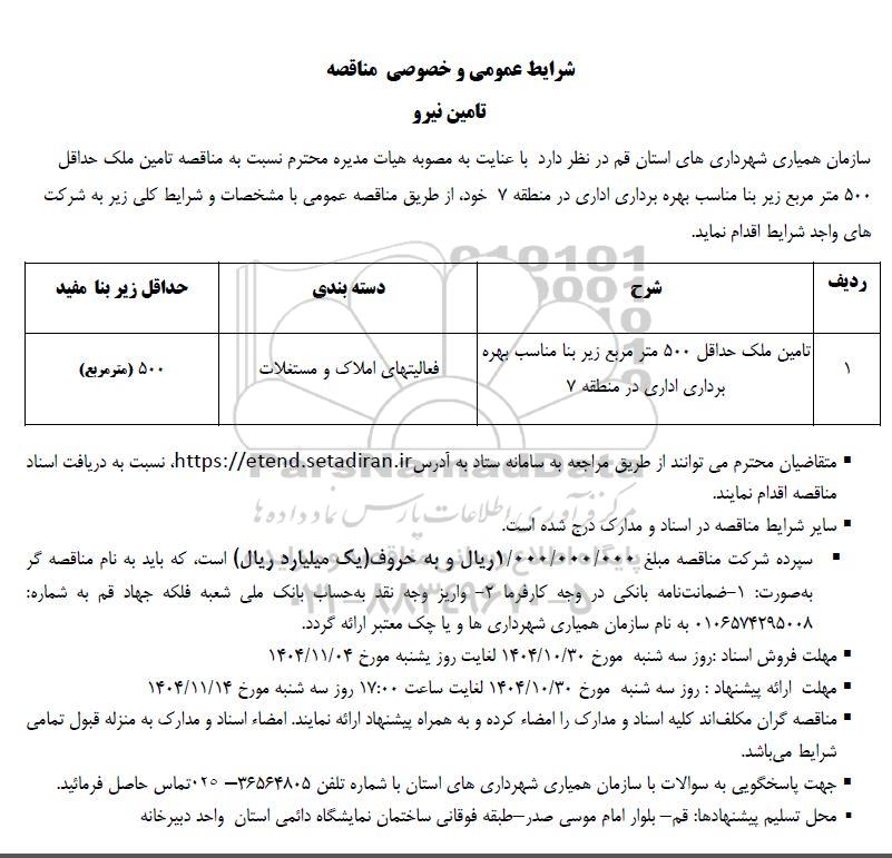 سازمان همیاری شهرداری های استان قم در نظر دارد با عنایت به مصوبه هیات مدیره محترم نسبت به مناقصه تامین ملک حداقل 500 مترمربع زیربنا مناسب بهره برداری اداری در منطقه 7 خود، از طریق مناقصه عمومی با مشخصات و شرایط کلی زیر به شرکت های واجد شرایط اقدام نماید.