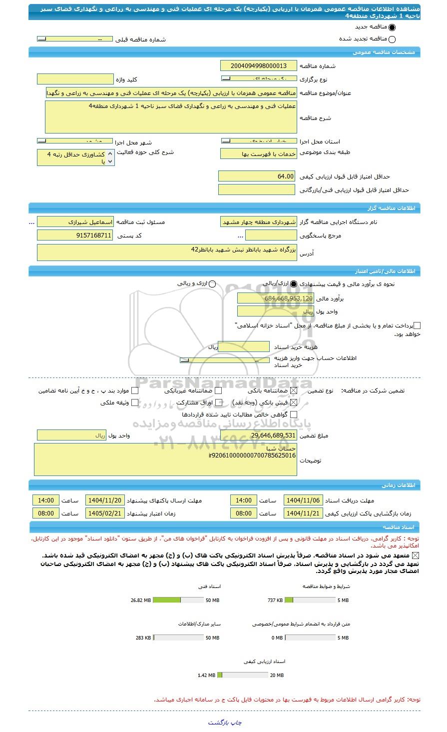 عنوان/موضوع مناقصهمناقصه عمومی همزمان با ارزیابی (یکپارچه) یک مرحله ای عملیات فنی و مهندسی به زراعی و نگهداری فضای سبز ناحیه 1 شهرداری منطقه4
