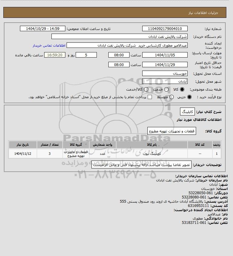 | 1 | -- | کوپلینگ تیوب | عدد | قطعات و تجهیزات تهویه مطبوع | 3 | 1404/11/12 |