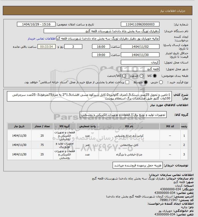 شرح کلی نیاز: 1-تامین و تحویل 25عدد دستک1.5متری گالوانیزه2-کابل شیرکوه مسی افشان1.5*2 به متراژ75مترطول3- 25عدد سرچراغی 100وات گلنور طبق مشخصات برگ استعلام پیوست
