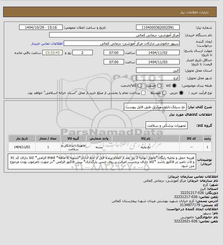 | 1 | -- | نخ بخیه | بسته | تجهیزات پزشکی و سلامت | 1 | 1404/11/02 |