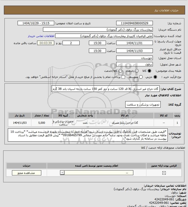 | 1 | -- | گان جراحی یکبار مصرف | عدد | تجهیزات پزشکی و سلامت | 5,000 | 1404/11/03 |