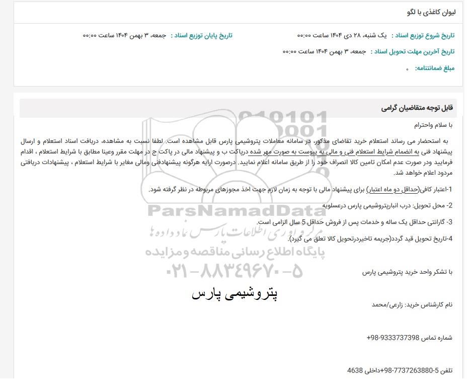 به استحضار می رساند استعلام خرید تقاضای مذکور در سامانه معاملات پتروشیمی پارس قابل مشاهده است. لطفا نسبت به مشاهده دریافت اسناد استعلام و ارسال پیشنهاد فنی به انضمام شرایط استعلام فنی و مالی به پیوست به صورت مهر شده در پاکت ب و پیشنهاد مالی در پاکت ج در مهلت مقرر و عينا مطابق با شرایط استعلام ، اقدام فرمایید و در صورت عدم امکان تامین کالا انصراف خود را از طریق سامانه اعلام نمایید. در صورت ارایه هرگونه پیشنهاد فنی و مالی مغایر با شرایط استعلام ، پیشنهادات دریافتی مردود اعلام خواهد شد.