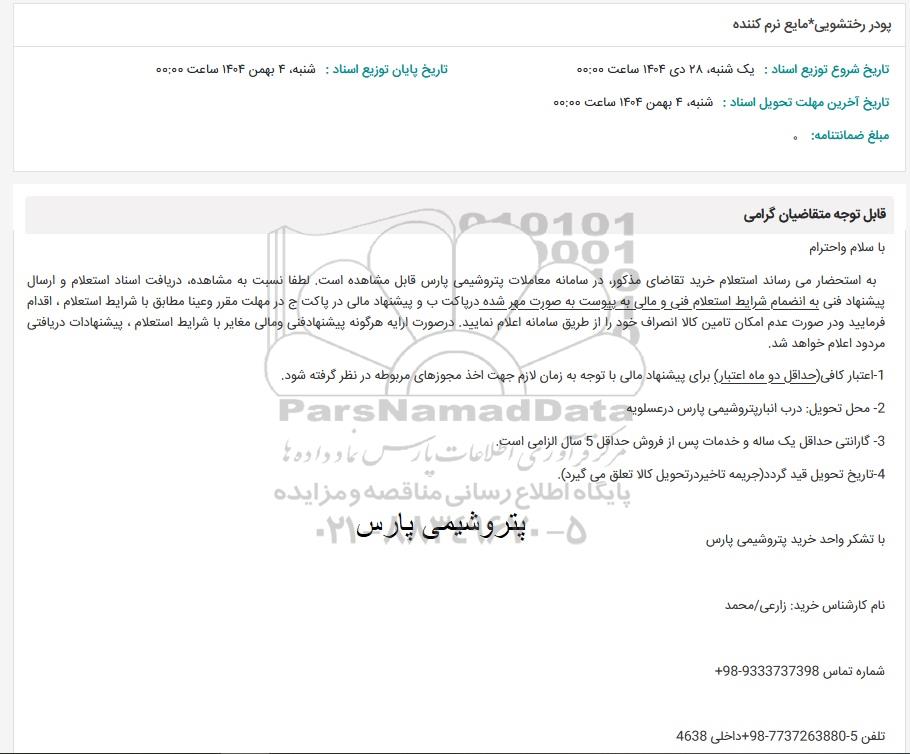 به استحضار می رساند استعلام خرید تقاضای مذکور در سامانه معاملات پتروشیمی پارس قابل مشاهده است. لطفا نسبت به مشاهده دریافت اسناد استعلام و ارسال پیشنهاد فنی به انضمام شرایط استعلام فنی و مالی به پیوست به صورت مهر شده در پاکت ب و پیشنهاد مالی در پاکت ج در مهلت مقرر وعينا مطابق با شرایط استعلام ، اقدام فرمایید و در صورت عدم امکان تامین کالا انصراف خود را از طریق سامانه اعلام نمایید. در صورت ارایه هرگونه پیشنهادفنی و مالی مغایر با شرایط استعلام ، پیشنهادات دریافتی مردود اعلام خواهد شد.