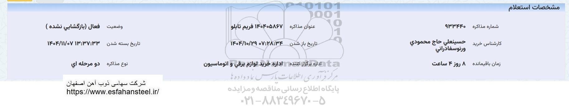 | شماره مذاکره: 933440 | عنوان مذاکره: 140405867 فریم تابلو | وضعیت: فعال (بازگشایی نشده) |
