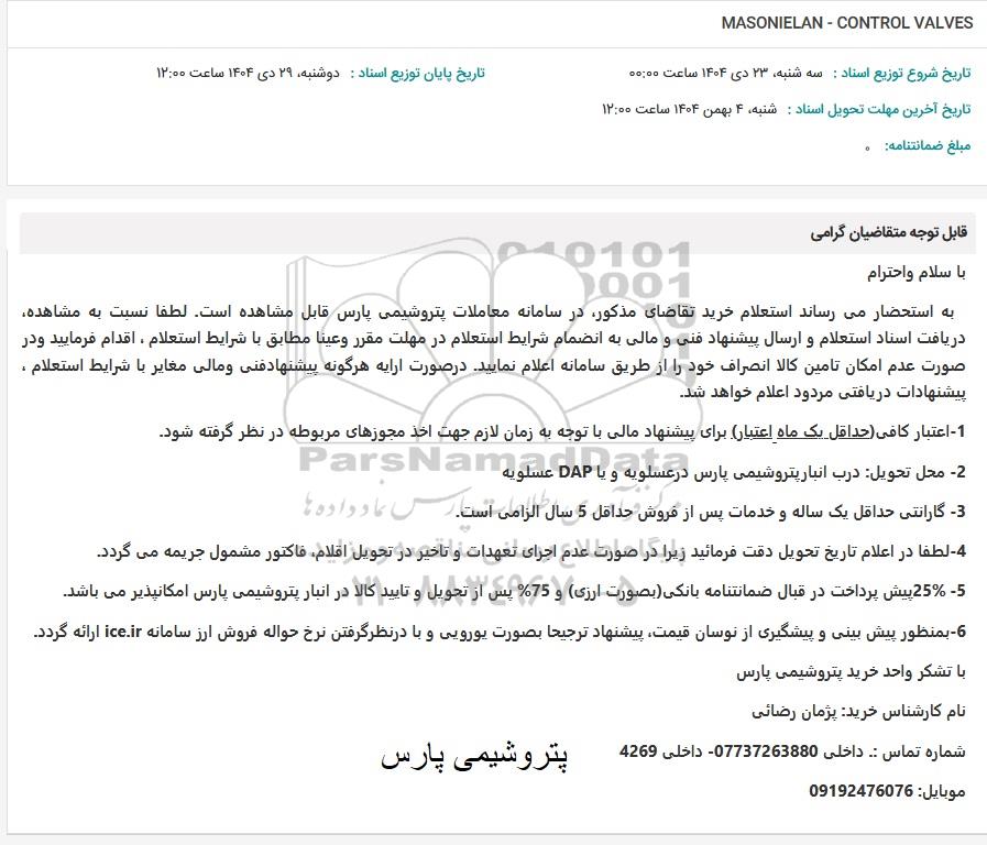 استعلام بها و موضوع استعلام استعلام MASONIELAN - CONTROL VALVES به اطلاع کلیه شرکتها و افراد متخصص واجد شرایط میرساند، آگهی گذار در نظر دارد از طریق استعلام بها، نسبت به انتخاب و دریافت پیشنهادات اقدام نماید. این استعلام با کد آگهی ثبت شده در سامانه خبرگزاری پارس نماد : 10160045 منتشر شده است. مشخصات استعلام : تاریخ شروع استعلام: 1404/10/29 آخرین مهلت ارسال پیشنهاد قیمت : 1404/10/29 و محل اجرای پروژه : استان مناقصات استان بوشهر میباشد. استعلام قیمت مورد درخواست : استعلام MASONIELAN - CONTROL VALVES با دستهبندیهای تخصصی و گروه های مرتبط : ابزار دقیق, شیرآلات, تجهیزات نفت و گاز, استعلام اطلاع رسانی میگردد.