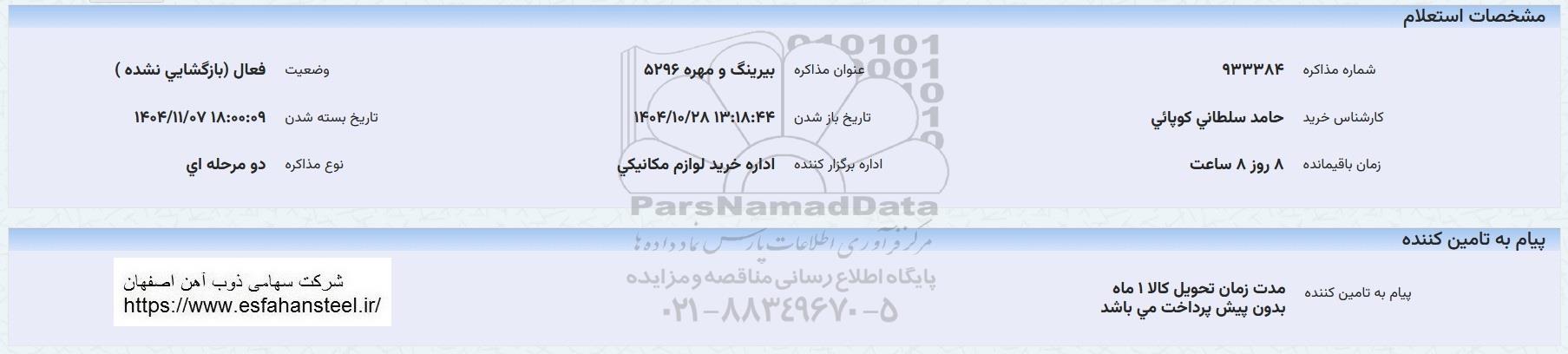 شماره مذاکره:  933384 عنوان مذاکره: بیرینگ و مهره 5296  وضعیت: فعال (بازگشایی نشده)