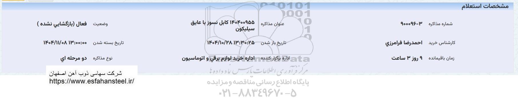 استعلام بها و موضوع استعلام استعلام کابل نسوز با عایق سیلیکون به اطلاع کلیه شرکتها و افراد متخصص واجد شرایط میرساند، آگهی گذار در نظر دارد از طریق استعلام بها، نسبت به انتخاب و دریافت پیشنهادات اقدام نماید. این استعلام با کد آگهی ثبت شده در سامانه خبرگزاری پارس نماد : 10160066 منتشر شده است. مشخصات استعلام : تاریخ شروع استعلام: 1404/10/29 آخرین مهلت ارسال پیشنهاد قیمت : 1404/11/08 و محل اجرای پروژه : استان مناقصات استان اصفهان میباشد. استعلام قیمت مورد درخواست : استعلام کابل نسوز با عایق سیلیکون با دستهبندیهای تخصصی و گروه های مرتبط : انواع مواد و قطعات نسوز, سیم و کابل, تجهیزات برق و الکترونیک, استعلام اطلاع رسانی میگردد.