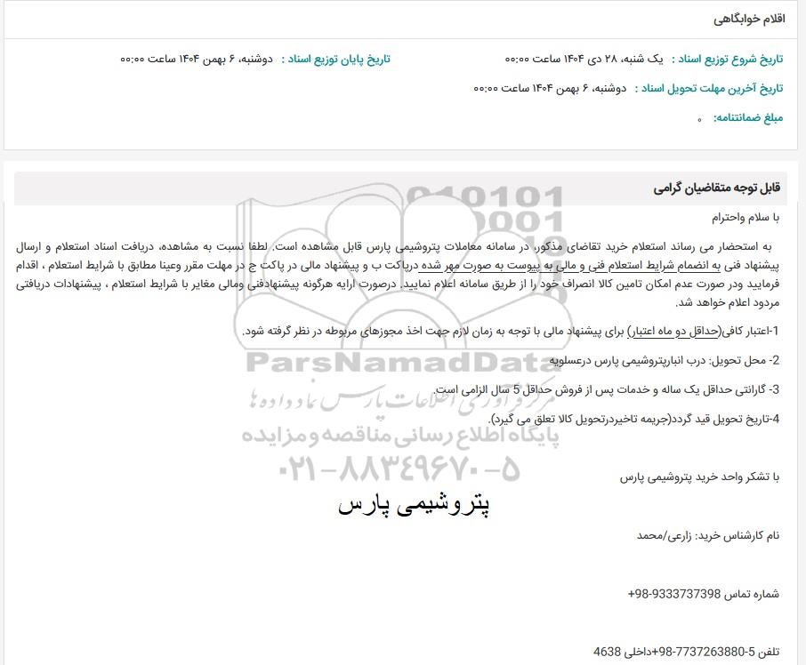 به استحضار می رساند استعلام خرید تقاضای مذکور در سامانه معاملات پتروشیمی پارس قابل مشاهده است. لطفا نسبت به مشاهده دریافت اسناد استعلام و ارسال