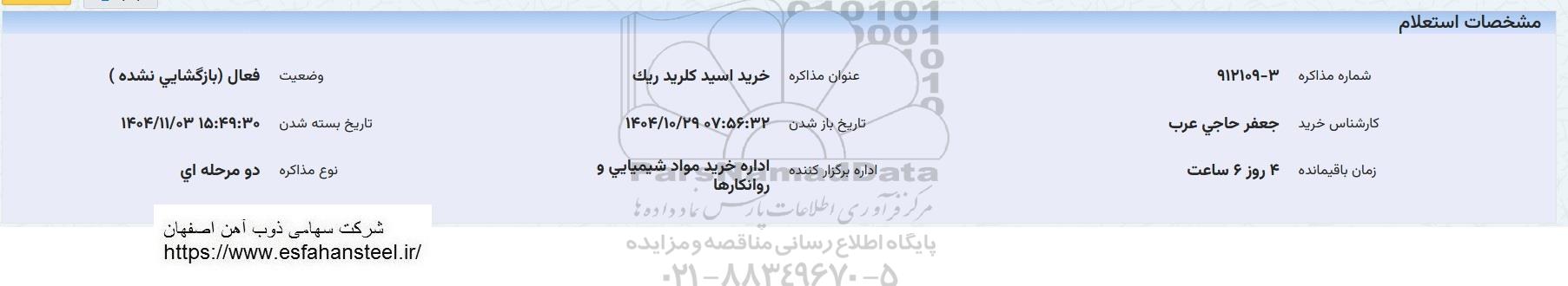 استعلام بها و موضوع استعلام استعلام خرید اسید کلریدریک به اطلاع کلیه شرکتها و افراد متخصص واجد شرایط میرساند، آگهی گذار در نظر دارد از طریق استعلام بها، نسبت به انتخاب و دریافت پیشنهادات اقدام نماید. این استعلام با کد آگهی ثبت شده در سامانه خبرگزاری پارس نماد : 10160081 منتشر شده است. مشخصات استعلام : تاریخ شروع استعلام: 1404/10/29 آخرین مهلت ارسال پیشنهاد قیمت : 1404/11/03 و محل اجرای پروژه : استان مناقصات استان اصفهان میباشد. استعلام قیمت مورد درخواست : استعلام خرید اسید کلریدریک با دستهبندیهای تخصصی و گروه های مرتبط : مواد شیمیایی, مواد اولیه کارخانجات, استعلام اطلاع رسانی میگردد.