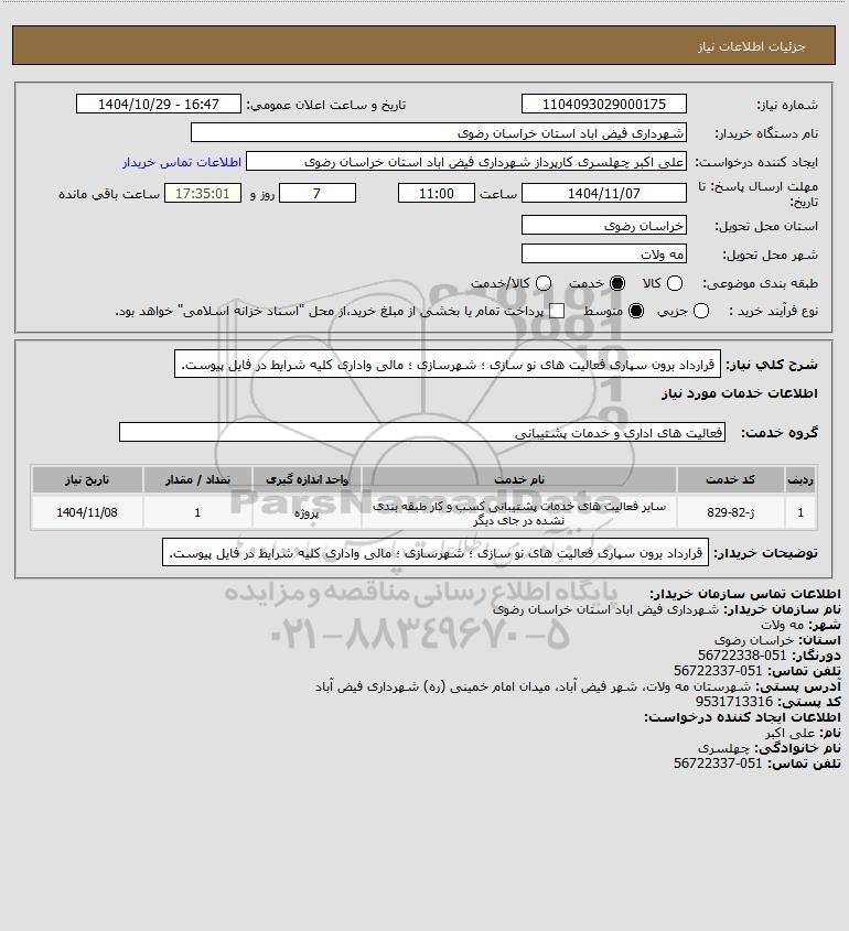 توضیحات خریدار:قرارداد برون سپاری فعالیت های نو سازی ؛ شهرسازی ؛ مالی واداری کلیه شرایط در فایل پیوست.