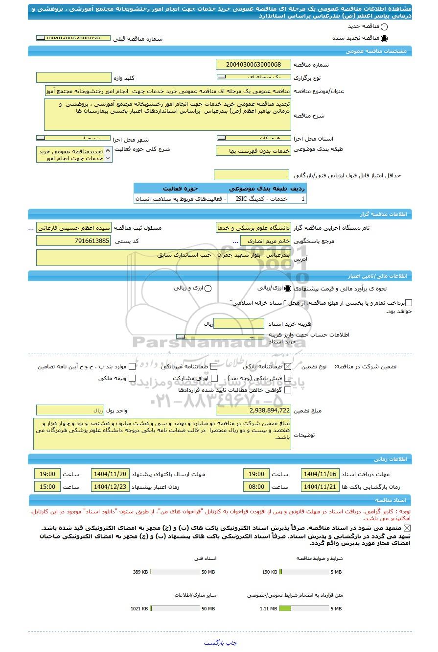 | توضیحات | مبلغ تضمین شرکت در مناقصه دو میلیارد و نهصد و سی و هشت میلیون و هشتصد و نود و چهار هزار و هفتصد و بیست و دو ریال منحصرا در قالب ضمانت نامه بانکی دروجه دانشگاه علوم پزشکی هرمزگان می باشد. | ||
