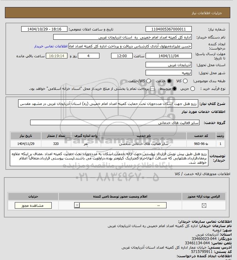 شرح کلی نیاز: رزرو هتل جهت اسکان مددجویان تحت حمایت کمیته امداد امام خمینی (ره) استان آذربایجان غربی در مشهد مقدس