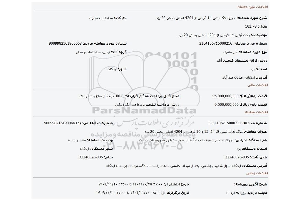 | شرح مورد معامله: حراج پلاک ثبتی 14 فرعی از 4204 اصلی بخش 20 یزد | نام کالا: ساختمان تجاری | |