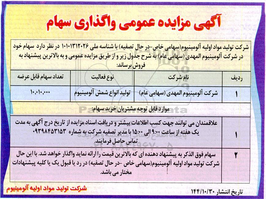 شرکت تولید مواد اولیه آلومینیوم (سهامی خاص- در حال تصفیه) با شناسه ملی 10101312026 در نظر دارد سهام خود در شرکت آلومینیوم المهدی (سهامی عام) به شرح جدول زیر و از طریق مزایده عمومی و به بالاترین پیشنهاد به فروش برساند: