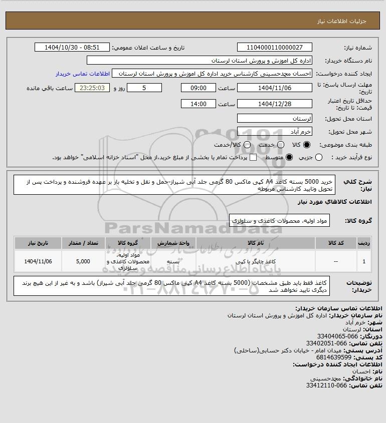 شرح کلی نیاز: خرید 5000 بسته کاغذ A4 کپی ماکس 80 گرمی جلد آبی شیراز-حمل و نقل و تخلیه بار بر عهده فروشنده و پرداخت پس از تحویل وتایید کارشناس مربوطه
