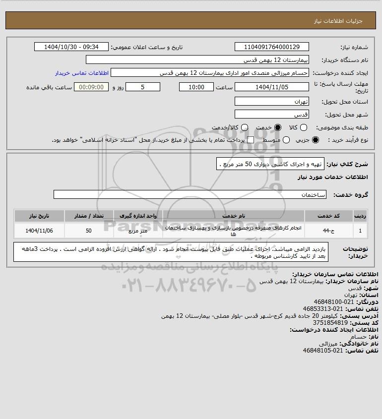شرح کلی نیاز: تهیه و اجرای کاشی دیواری 50 متر مربع .