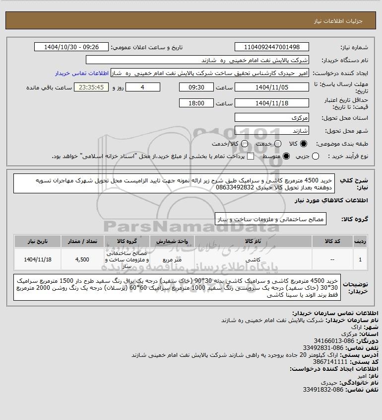 | 1 | -- | کاشی | متر مربع | مصالح ساختمانی و ملزومات ساخت و ساز | 4,500 | 1404/11/18 |