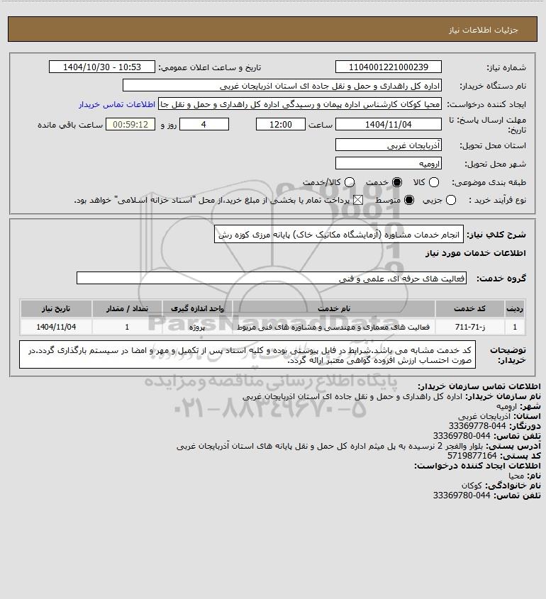 شرح کلی نیاز: انجام خدمات مشاوره (آزمایشگاه مکانیک خاک) پایانه مرزی کوزه رش