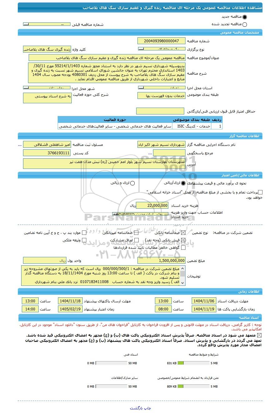 مناقصه مناقصه عمومی یک مرحله ای مناقصه زنده گیری و عقیم سازی سگ های بلاصاحب, مناقصه، مناقصه عمومی یک مرحله ای مناقصه زنده گیری و عقیم سازی سگ های بلاصاحب