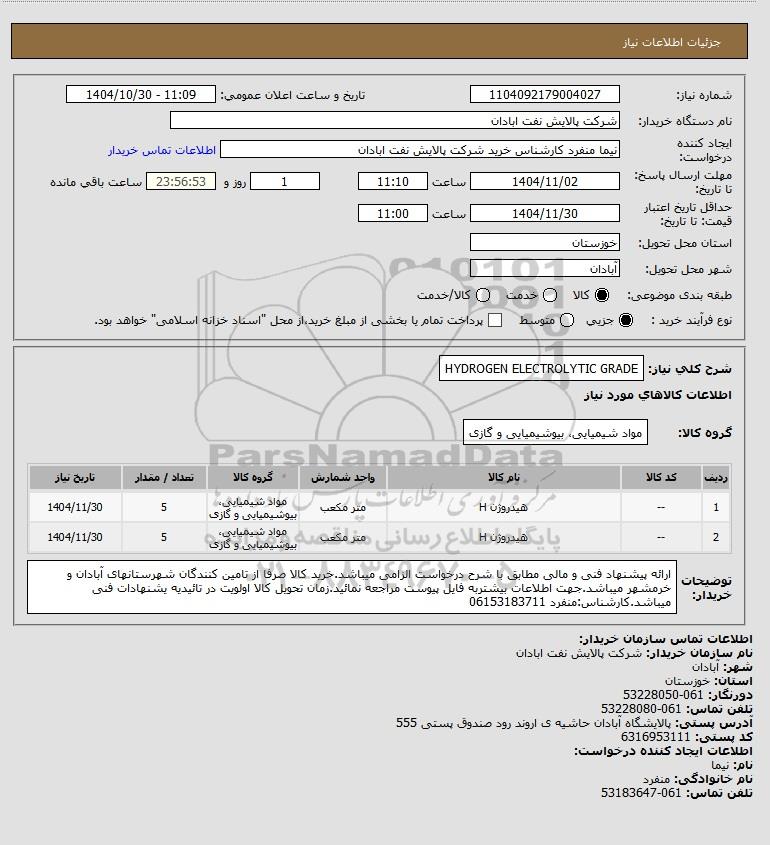 شرح کلی نیاز: HYDROGEN ELECTROLYTIC GRADE