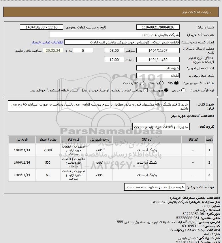 شرح کلی نیاز: خرید 3 قلم پکینگ/ رائه پیشنهاد فنی و مالی مطابق با شرح پیوست الزامی می باشد/ پرداخت به صورت اعتباری 45 روز می باشد