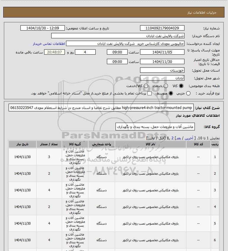 شرح کلی نیاز: high-pressure4-inch tractor-mounted pump مطابق شرح تقاضا و اسناد مندرج در شرایط استعلام محمدی 06153223547