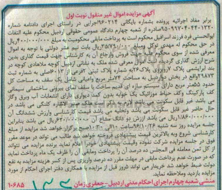 مزایده ملک مساحت هفتاد و چهار متر نوبت اول کلاسه 960214