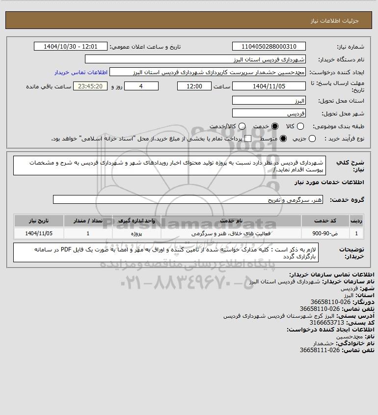 استعلام بها و موضوع استعلام استعلام شهرداری فردیس در نظر دارد نسبت به پروژه تولید محتوای اخبار رویدادهای شهر و شهرداری فردیس به شرح و مشخصات پیوست اقدام نماید./ به اطلاع کلیه شرکتها و افراد متخصص واجد شرایط میرساند، آگهی گذار در نظر دارد از طریق استعلام بها، نسبت به انتخاب و دریافت پیشنهادات اقدام نماید. این استعلام با کد آگهی ثبت شده در سامانه خبرگزاری پارس نماد : 10164709 منتشر شده است. مشخصات استعلام : تاریخ شروع استعلام: 1404/10/30 آخرین مهلت ارسال پیشنهاد قیمت : 1404/11/05 و محل اجرای پروژه : استان مناقصات استان البرز میباشد. استعلام قیمت مورد درخواست : استعلام شهرداری فردیس در نظر دارد نسبت به پروژه تولید محتوای اخبار رویدادهای شهر و شهرداری فردیس به شرح و مشخصات پیوست اقدام نماید./ با دستهبندیهای تخصصی و گروه های مرتبط : طراحی چاپ و تبلیغات, تیزرهای تبلیغاتی و تلویزیون, استعلام اطلاع رسانی میگردد.