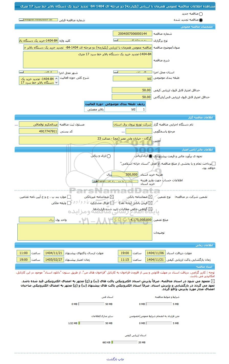 | مبلغ تضمین | 4,175,000,000 | واحد پول | ریال |