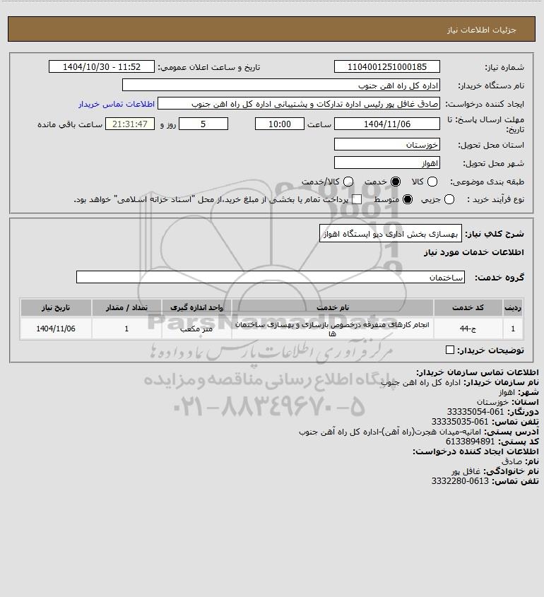 شرح کلی نیاز: بهسازی بخش اداری دپو ایستگاه اهواز