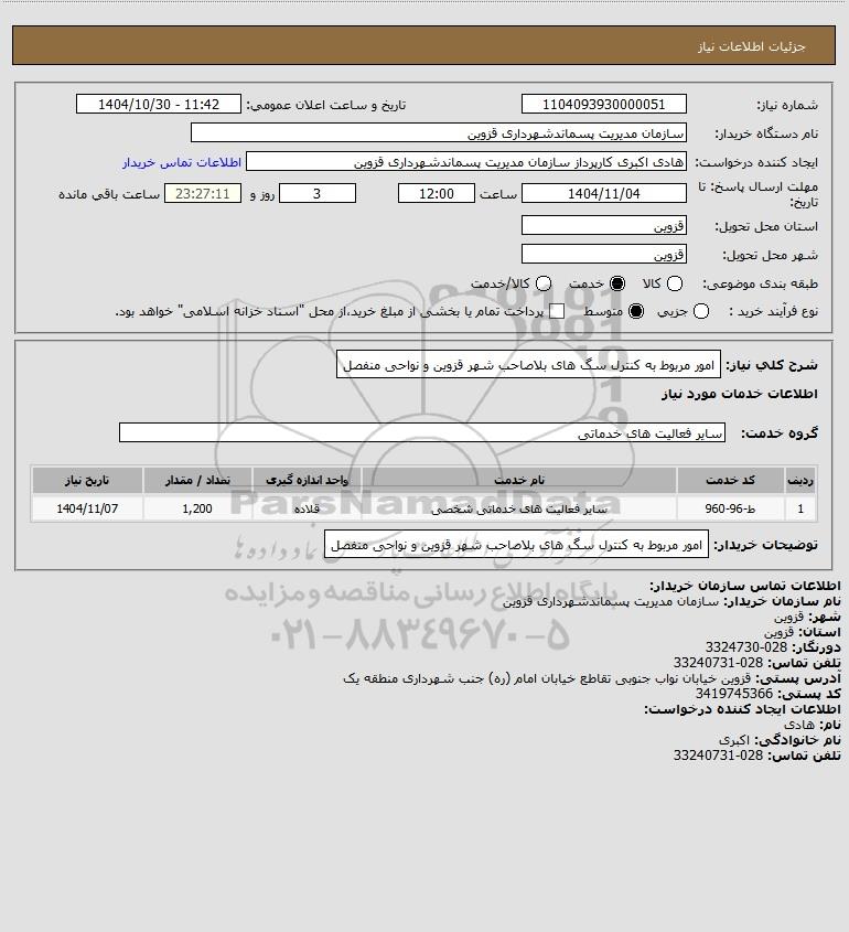 توضیحات خریدار:امور مربوط به کنترل سگ های بلاصاحب شهر قزوین و نواحی منفصل