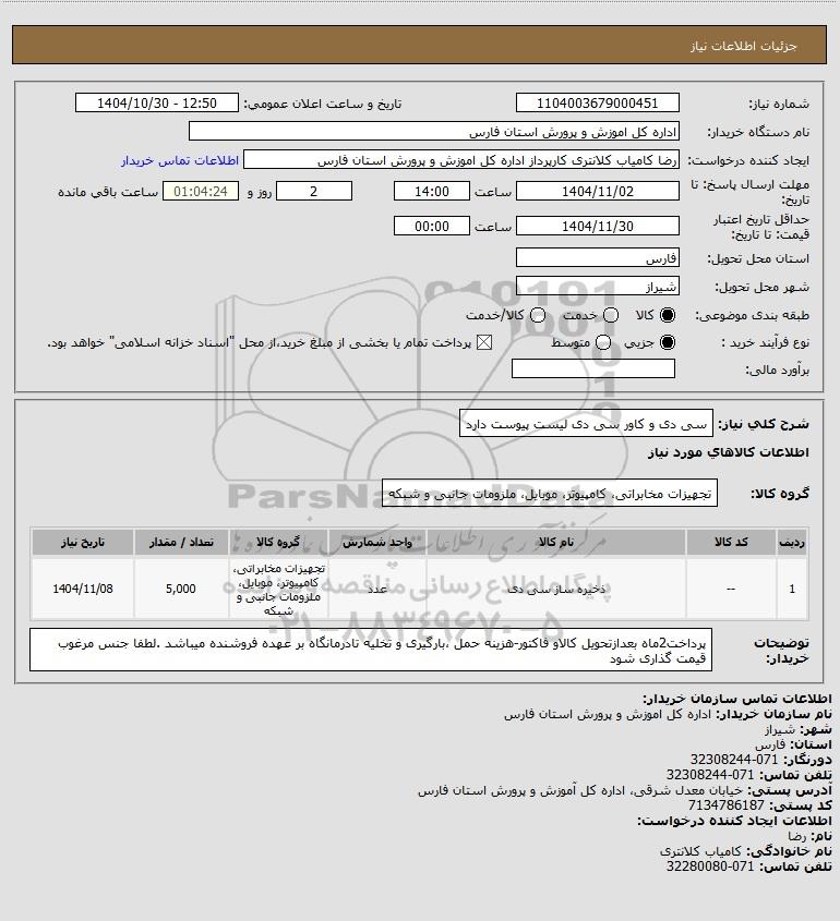 | 1 | -- | ذخیره ساز سی دی | عدد | تجهیزات مخابراتی، کامپیوتر، موبایل، ملزومات جانبی و شبکه | 5,000 | 1404/11/08 |