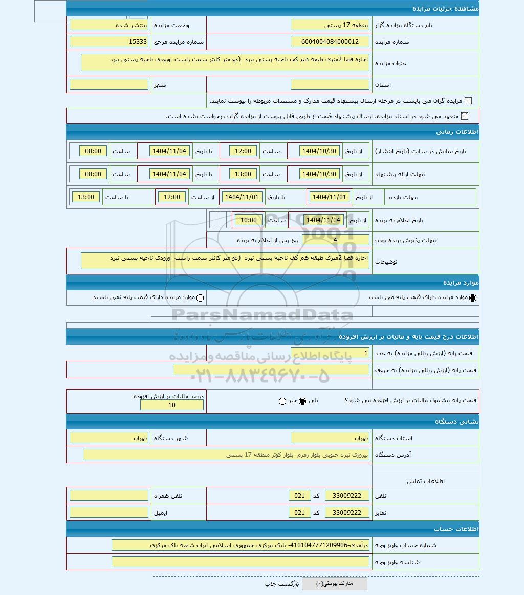 | نام دستگاه مزایده گزار | منطقه 17 پستی | وضعیت مزایده | منتشر شده | |
