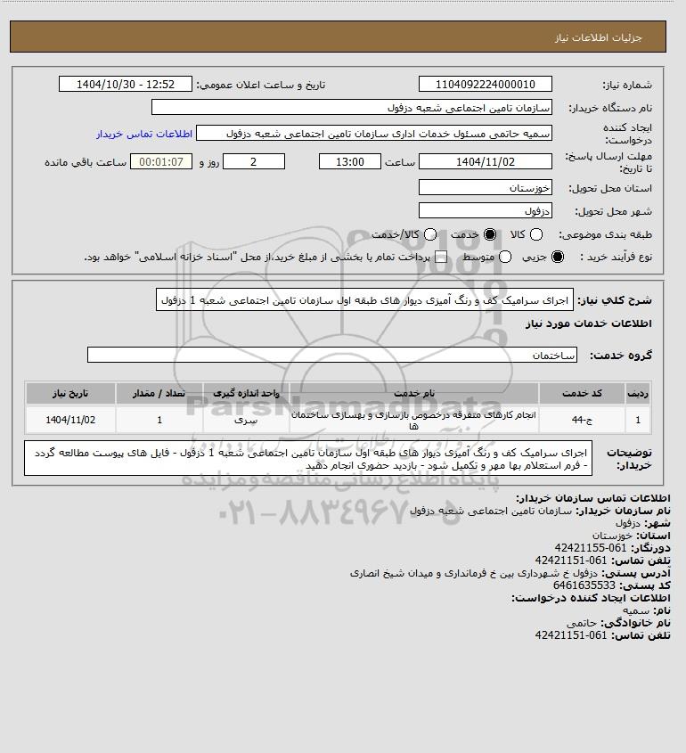 شرح کلی نیاز: اجرای سرامیک کف و رنگ آمیزی دیوار های طبقه اول سازمان تامین اجتماعی شعبه 1 دزفول