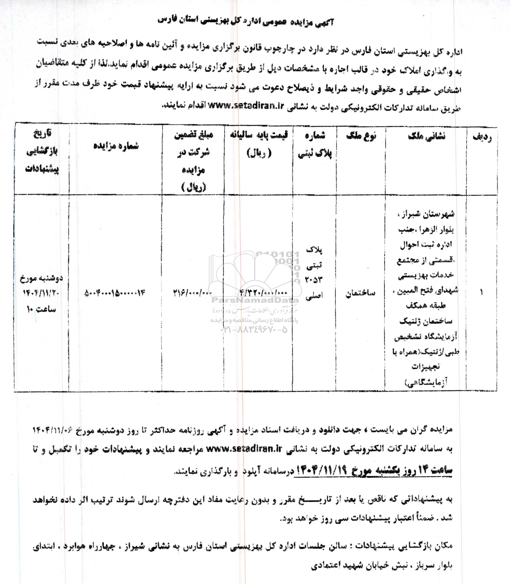 مزایده عمومی مزایده واگذاری یکباب ساختمان اداری برگزار میگردد. از کلیه افراد متخصص و شرکت‌های واجد شرایط دعوت به عمل می‌آید تا در این مزایده با کد خبرگزاری پارس نماد : 10165563 شرکت نمایند تاریخ شروع مزایده : 1404/10/30 مهلت شرکت در مزایده: تا پایان روز 1404/11/06 مکان برگزاری اموال واگذاری استان‌های مزایدات استان فارس و دسته‌بندی‌های مربوط به این حراجی تجهیزات پزشکی, واگذاری ورزشگاه، پارکینگ، غرفه و بوفه میباشد.