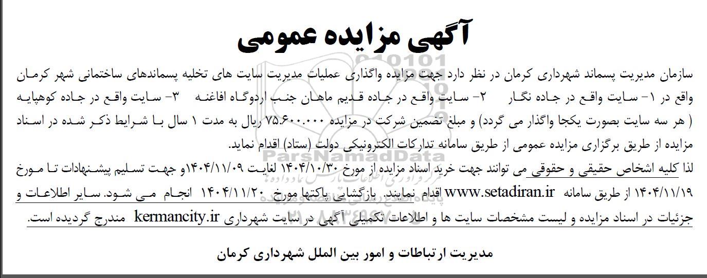 سازمان مدیریت پسماند شهرداری کرمان در نظر دارد جهت مزایده واگذاری عملیات مدیریت سایت های تخلیه پسماندهای ساختمانی عمرانی شهر کرمان واقع در 1- سایت جاده نگار 2- سایت جاده قدیم ماهان جنب اردوگاه افاغنه 3- سایت واقع در جاده کوهپایه (هر سه سایت به صورت یکجا واگذار میگردد) و مبلغ تضمین شرکت در مزایده 75.600.000 ریال به مدت یکسال با شرایط ذکر شده در اسناد مزایده از طریق برگزاری مزایده عمومی از طریق سامانه تدارکات الکترونیکی دولت اقدام نماید. لذا کلیه اشخاص حقیقی و حقوقی می توانند جهت خرید اسناد مزایده از مورخ 1404.10.30 لغایت 1404.11.09 و جهت تسلیم پیشنهادات تا مورخ 1404.11.19 از طریق سامانه ستاد اقدام نمایند. بازگشایی پاکتها مورخ 1404.11.20 انجام می شود. سایر اطلاعات و جزییات در اسناد مزایده و اطلاعات تکمیلی آگهی در سایت شهرداری kermancity.ir مندرج گردیده است
