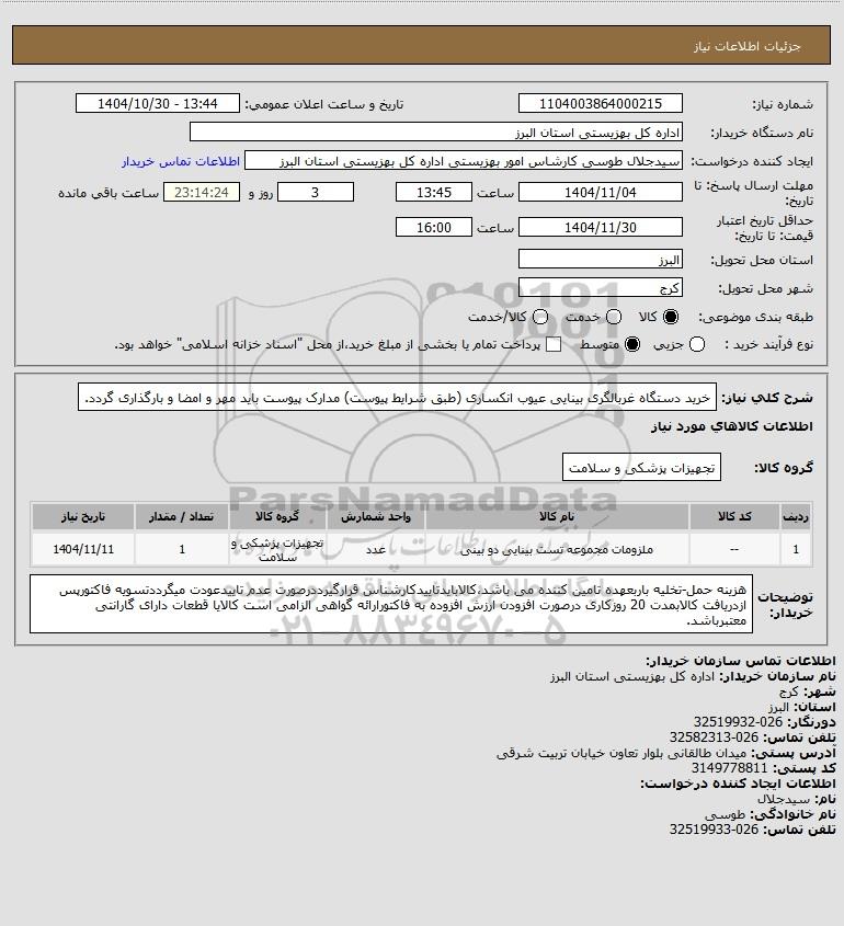استعلام بها و موضوع استعلام استعلام خرید دستگاه غربالگری بینایی عیوب انکساری (طبق شرایط پیوست) مدارک پیوست باید مهر و امضا و بارگذاری گردد. به اطلاع کلیه شرکت‌ها و افراد متخصص واجد شرایط می‌رساند، آگهی گذار در نظر دارد از طریق استعلام بها، نسبت به انتخاب و دریافت پیشنهادات اقدام نماید. این استعلام با کد آگهی ثبت شده در سامانه خبرگزاری پارس نماد : 10166272 منتشر شده است. مشخصات استعلام : تاریخ شروع استعلام: 1404/10/30 آخرین مهلت ارسال پیشنهاد قیمت : 1404/11/04 و محل اجرای پروژه : استان مناقصات استان البرز میباشد. استعلام قیمت مورد درخواست : استعلام خرید دستگاه غربالگری بینایی عیوب انکساری (طبق شرایط پیوست) مدارک پیوست باید مهر و امضا و بارگذاری گردد. با دسته‌بندی‌های تخصصی و گروه های مرتبط : خدمات و تجهیزات آزمایشگاهی و پزشکی, استعلام اطلاع رسانی میگردد.