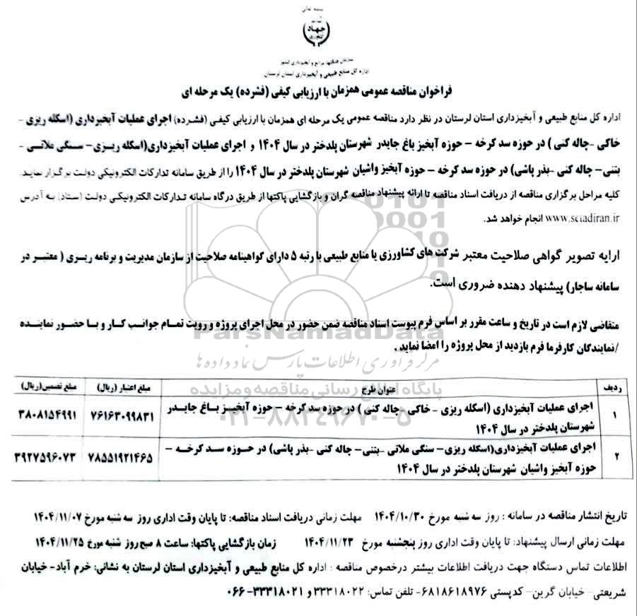 اداره کل منابع طبیعی و آبخیزداری استان لرستان در نظر دارد مناقصه عمومی یک مرحله ای همزمان با ارزیابی کیفی (فشرده) اجرای عملیات آبخیزداری (اسکله ریزی- خاکی- چاله کنی) در حوزه سد کرخه- حوزه آبخیز باغ جایدر شهرستان پلدختر در سال 1404 و اجرای عملیات آبخیزداری (اسکله ریزی- سنگی ملاتی- بتنی - چاله کنی- بذرپاشی) در حوزه سد کرخه- حوزه آبخیز واشیان شهرستان پلدختر در سال 1404 را از طریق سامانه تدارکات الکترونیکی دولت برگزار نماید.