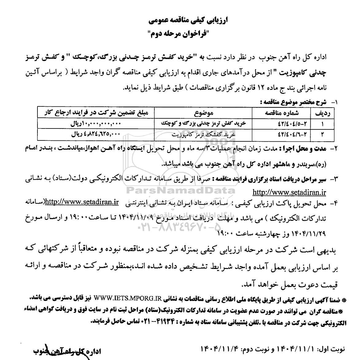 مناقصه خرید کفش ترمز چدنی بزرگ، کوچک و کفش ترمز چدنی کامپوزیت - مرحله دوم از کلیه افراد متخصص و شرکتها واجد شرایط دعوت به عمل میآید در مناقصه با کد خبرگزاری پارس نماد: 10166491 شرکت نمایند.
