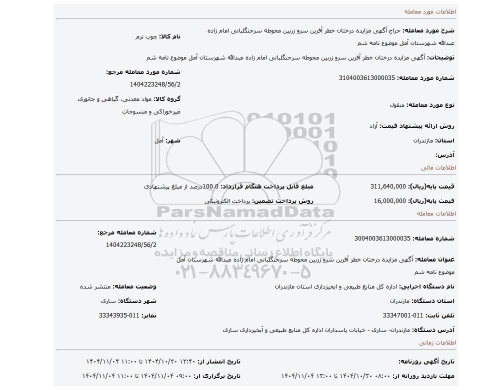 | عنوان معامله: آگهی مزایده درختان خطر آفرین سرو زربین محوطه سرجنگلبانی امام زاده عبدالله شهرستان آمل موضوع نامه شم | ||