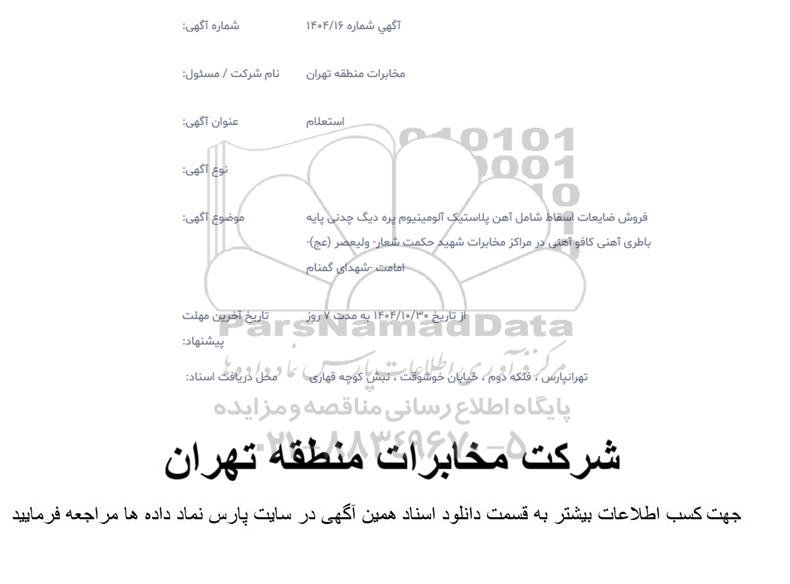 موضوع آگهی: فروش ضایعات اسقاط شامل آهن، پلاستیک آلومینیوم پره دیگ چدنی پایه باطری آهنی کافو آهنی در مرکز مخابرات شهید حکمت شعار- ولیعصر (عج)- امامت- شهدای گمنام
