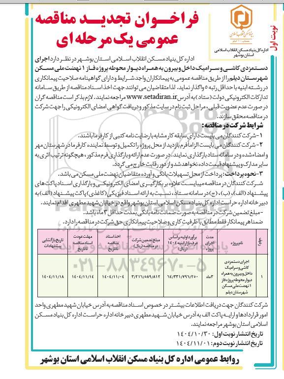 اداره کل بنیاد مسکن انقلاب اسلامی استان بوشهر در نظر دارد اجرای دستمزدی کاشی و سرامیک داخل و بیرون به همراه محوطه پروژه فاز 1 نهضت ملی مسکن شهرستان دیلم را از طریق مناقصه عمومی به پیمانکاران واجد شرایط و دارای گواهینامه صلاحیت پیمانکاری در رشته ابنیه با حداقل رتبه 5 واگذار نماید لذا متقاضیان میتوانند جهت اخذ اسناد مناقصه از طریق سامانه تدارکات الکترونیکی دولت( ستاد) به آدرس ستاد ایران مراجعه نمایند. لازم بذکر است مناقصه گران در صورت عدم عضویت قبلی ، مراحل ثبت نام در سایت مذکور و دریافت گواهی امضای الکترونیکی را جهت شرکت در مناقصه محقق سازند.